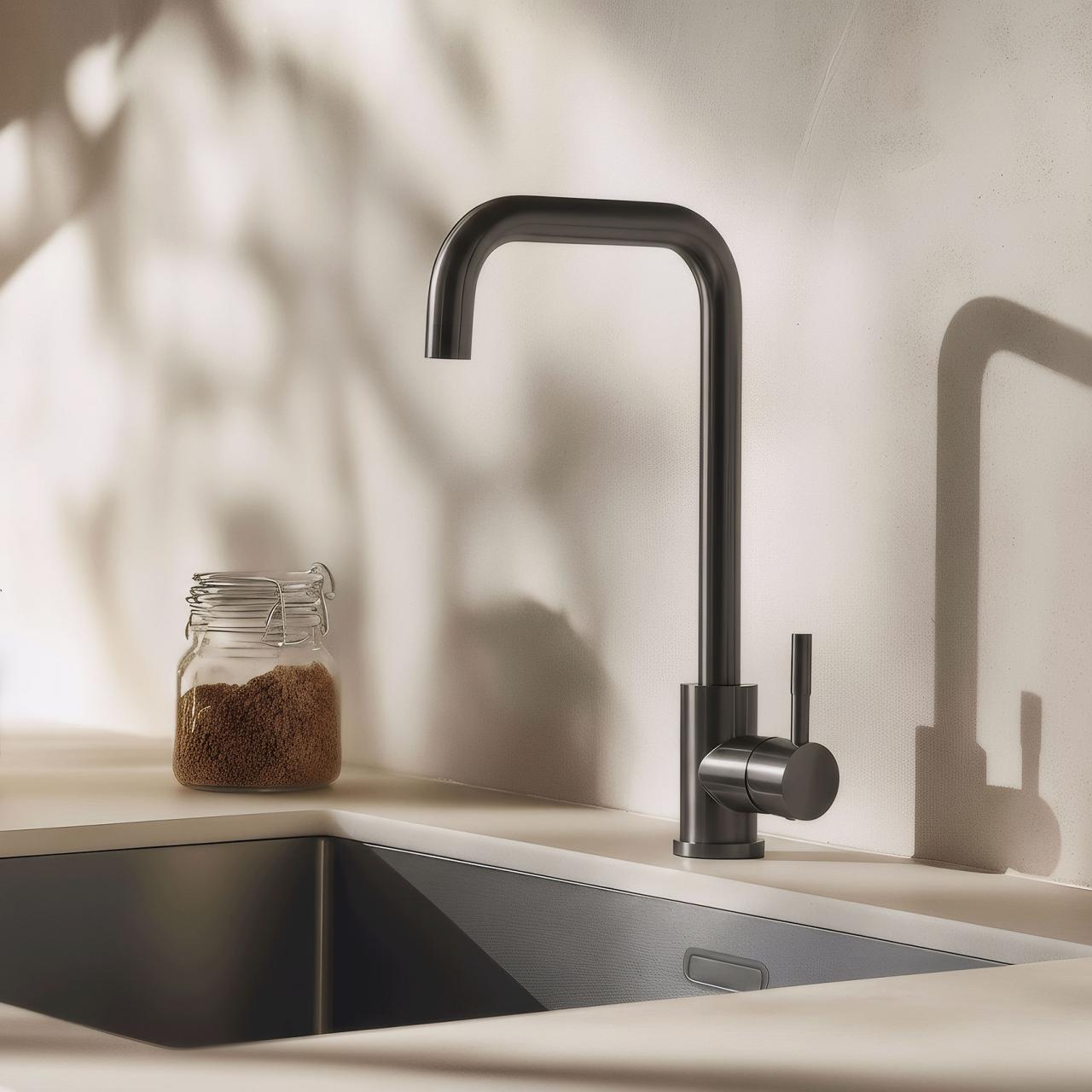 Combine style and functionality with the Pure.Sink Elite Steel kitchen mixer tap. This high-quality gun metal kitchen faucet, model PS8010-61, is designed to give your kitchen a modern and sleek look while maximizing ease of use.