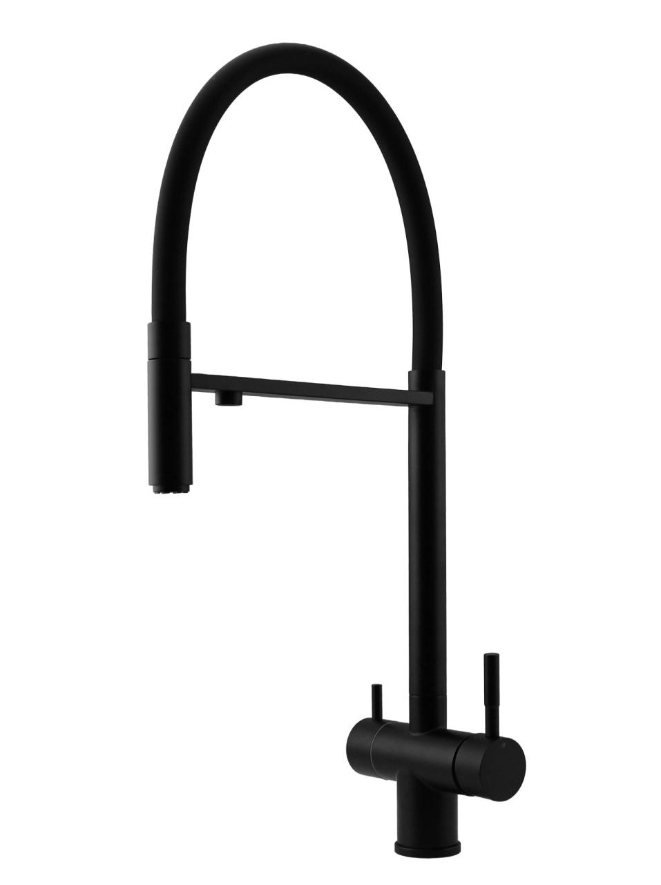 The Pure.Sink Elite Steel 3-way kitchen faucet combines modern design with extra ease of use. This faucet supplies both regular tap water and filtered water via separate controls, eliminating the need for a second faucet. The flexible black silicone spout offers maximum freedom of movement and gives your kitchen a contemporary look.