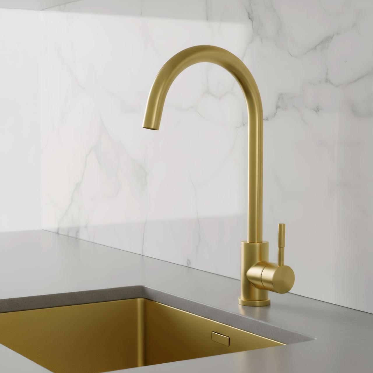 The Pure.Sink Elite Steel kitchen mixer tap combines sleek design with high functionality. The swivel spout makes it easy to perform various tasks in the kitchen, while the elegant brushed gold provides a modern appearance that fits in any kitchen.